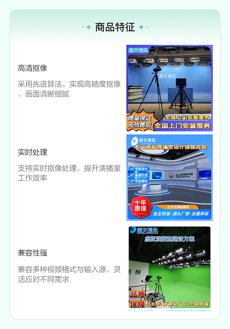 在虛擬演播室綠幕配置方面,鼎天視訊系統(tǒng)配備了優(yōu)化的照明方案和背景設(shè)計,確保背景與主播圖像的完美融合,不僅讓節(jié)目視覺效果提升,還能極大降低后期制作難度。